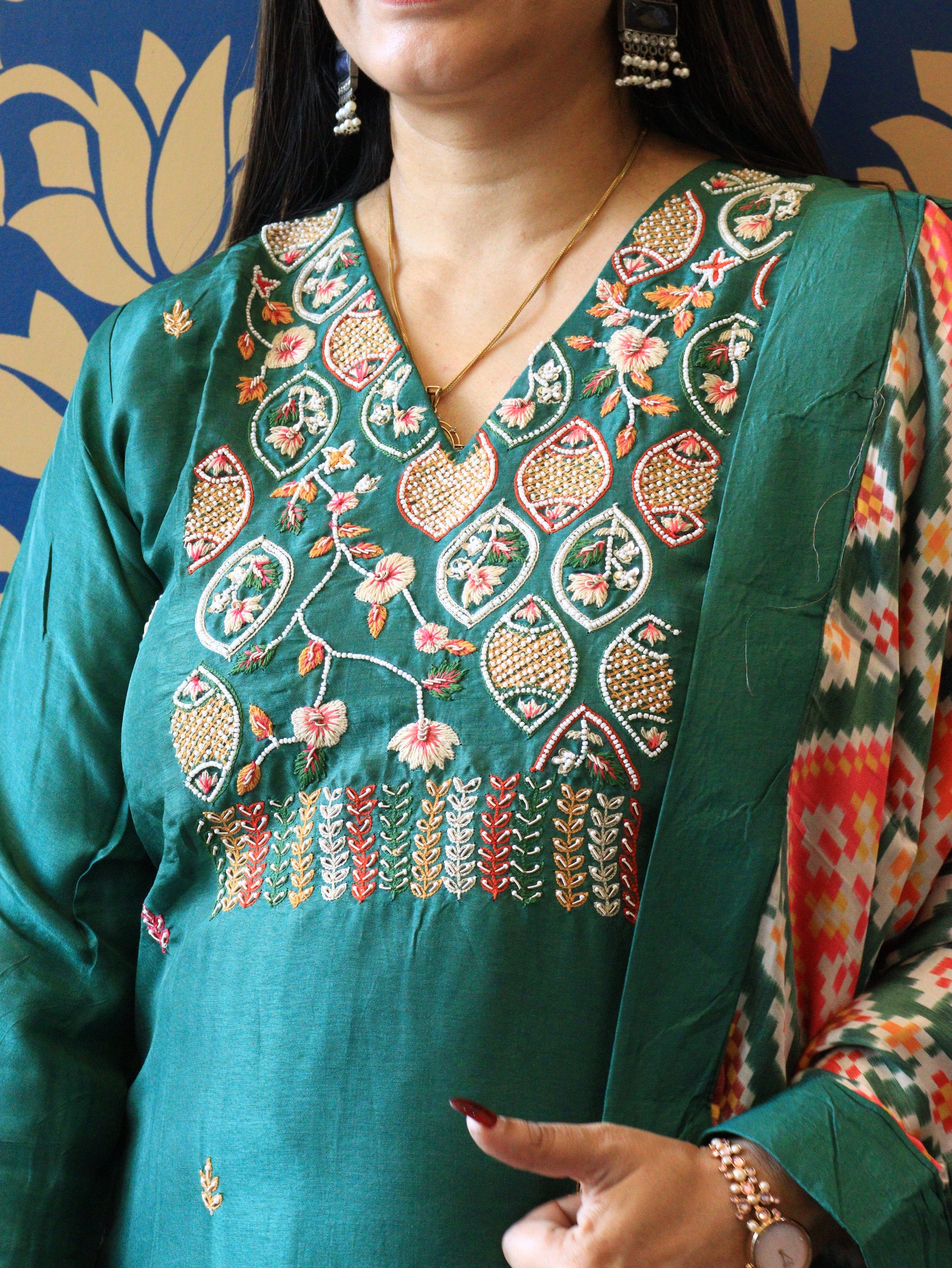 Elevate your ethnic wardrobe with the timeless charm of the Aarohi Hand-Embroidered Kurta Set, crafted for women who appreciate elegant details and effortless comfort. This beautiful kurta is made from rich silk-blend fabric, adorned with intricate hand embroidery on the yoke, featuring delicate floral and paisley motifs enhanced with fine threadwork and bead accents.