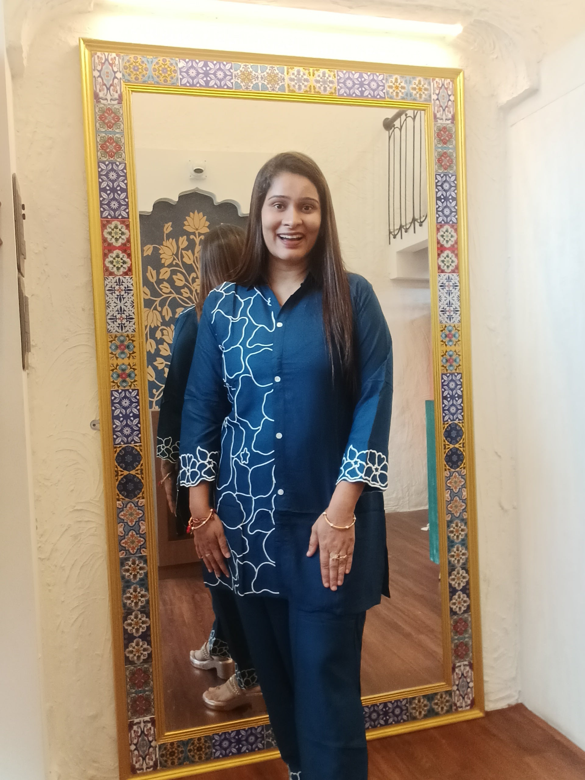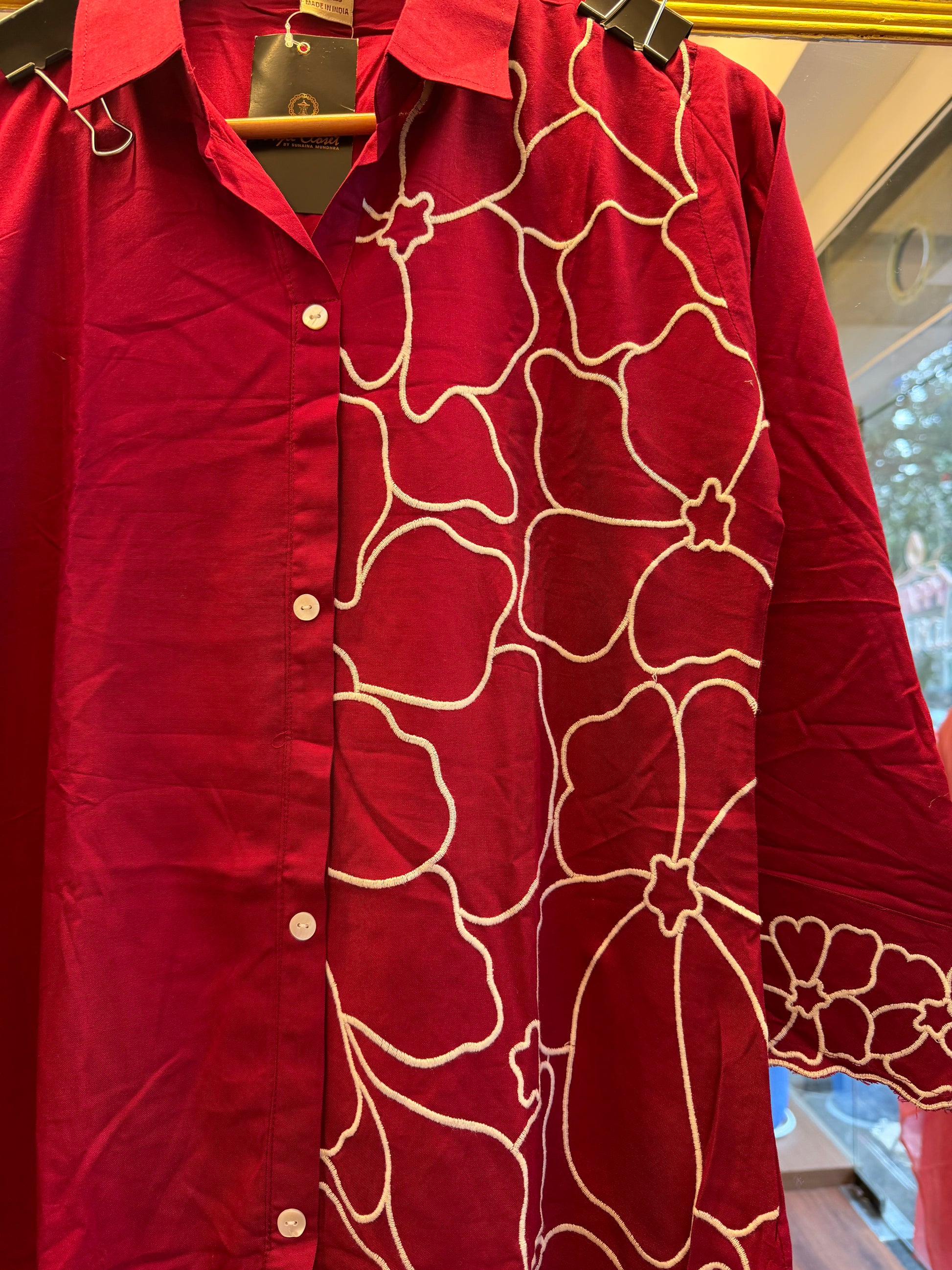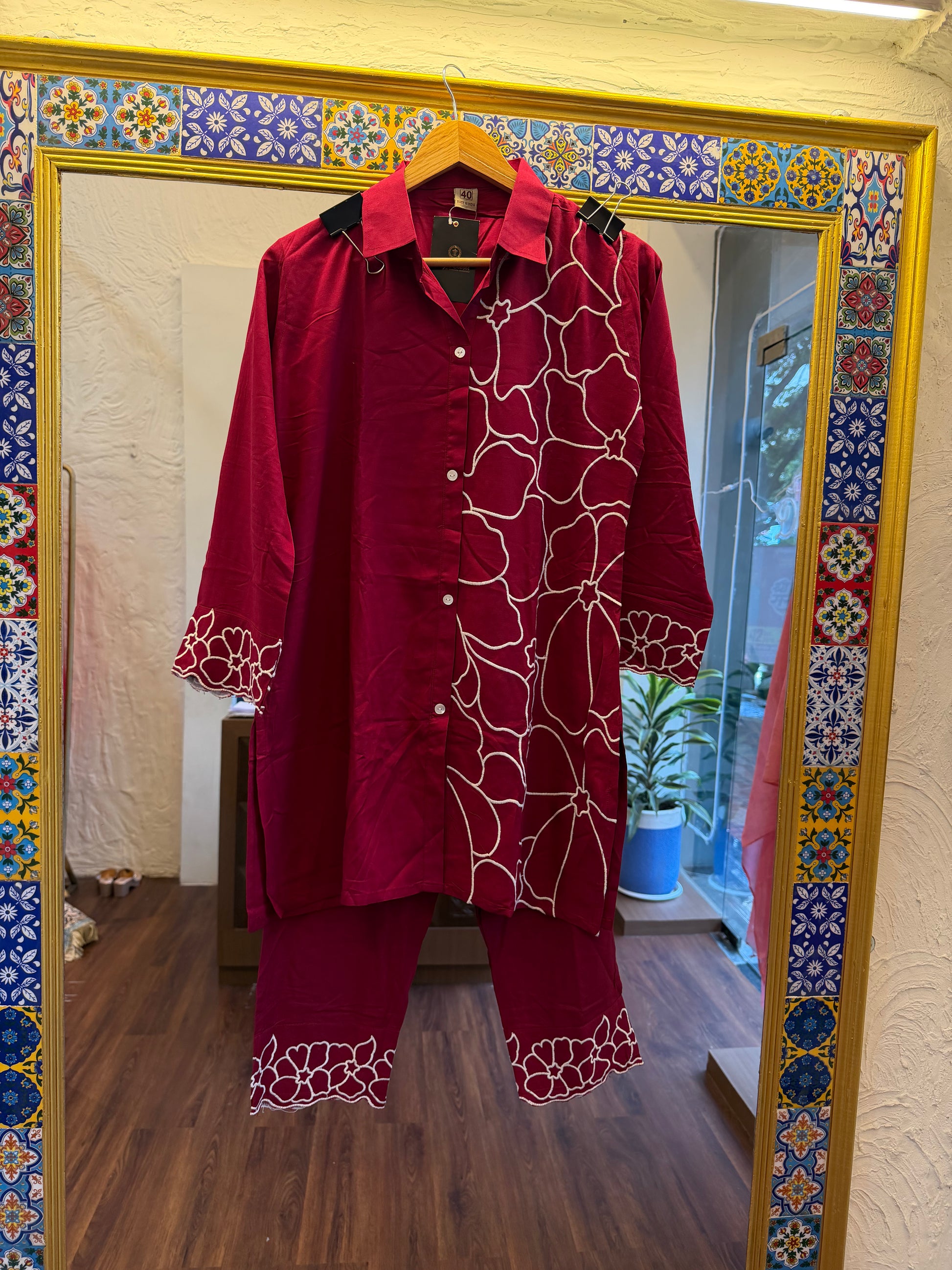 This stylish coord set is crafted in soft cotton fabric featuring bold indigo blue/maroon tones with striking white abstract floral embroidery. The straight-fit kurta comes with button-down detailing and printed sleeve cuffs, paired with matching straight pants adorned with coordinated border prints at the hem. A chic and comfortable ensemble that can be styled effortlessly for casual outings, workwear, or day-to-day elegance.