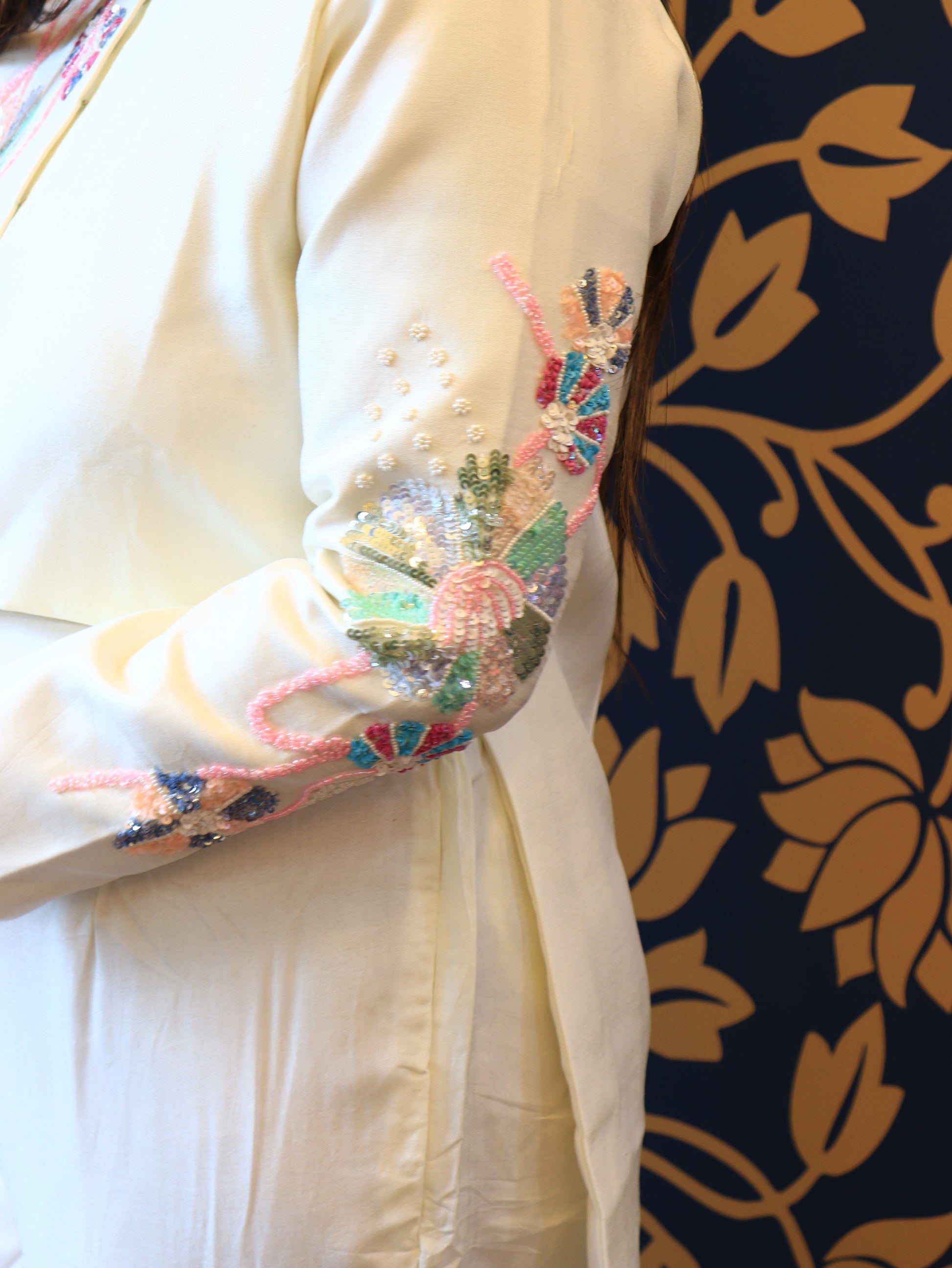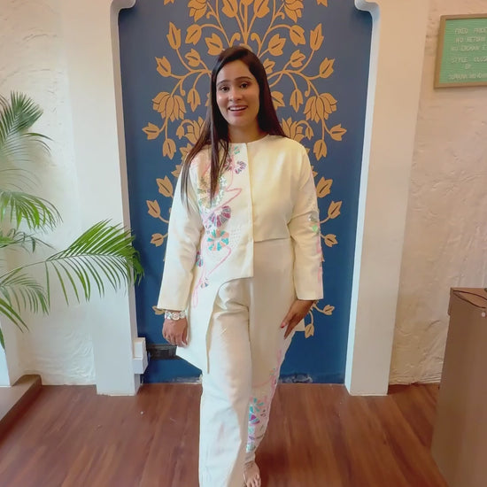 Smart 2-piece Indo-Western set crafted in luxurious heavy ho silk fabric, featuring a stylish shirt and coordinated pants. The outfit stands out with intricate cutdana and sequin hand embroidery on the shirt, sleeves, and pants — adding a rich, festive charm. The uneven shirt hemline gives a trendy silhouette, perfectly balancing elegance and modern appeal. Ideal for festive gatherings, parties, or special occasions.