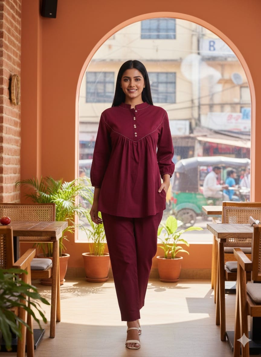Elevate your everyday style with this chic Maroon Cotton Co-ord Set. Featuring a smart A-line kurta with a mandarin collar, front button placket, and gathered yoke detailing, paired with straight-fit pants for a comfortable yet elegant look. Crafted in breathable pure cotton, this set is perfect for casual outings, workwear, or day-long comfort with a touch of sophistication.