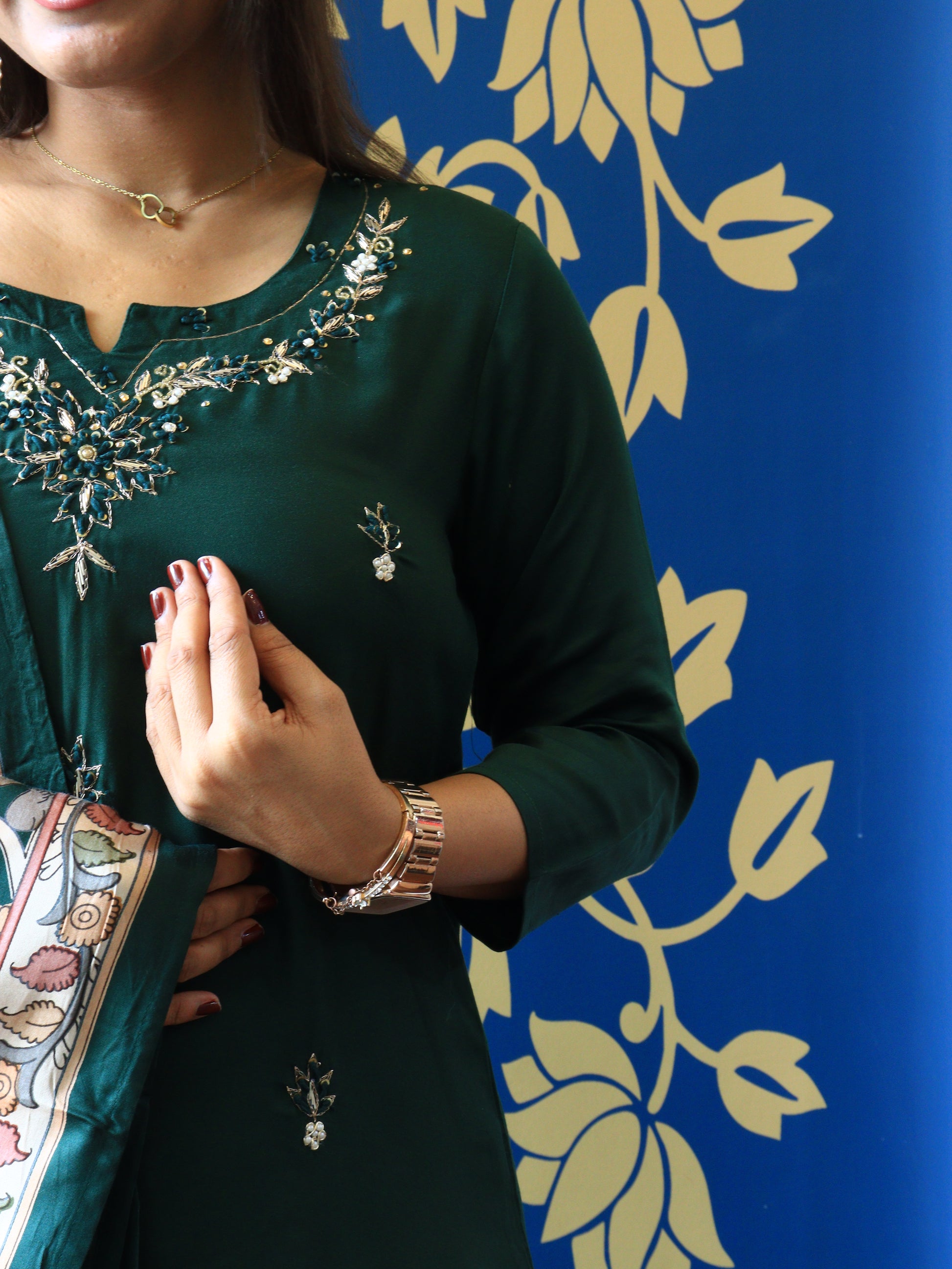 Emerald Green Embellished Silk Suit Set with Kashmiri-Print Dupatta