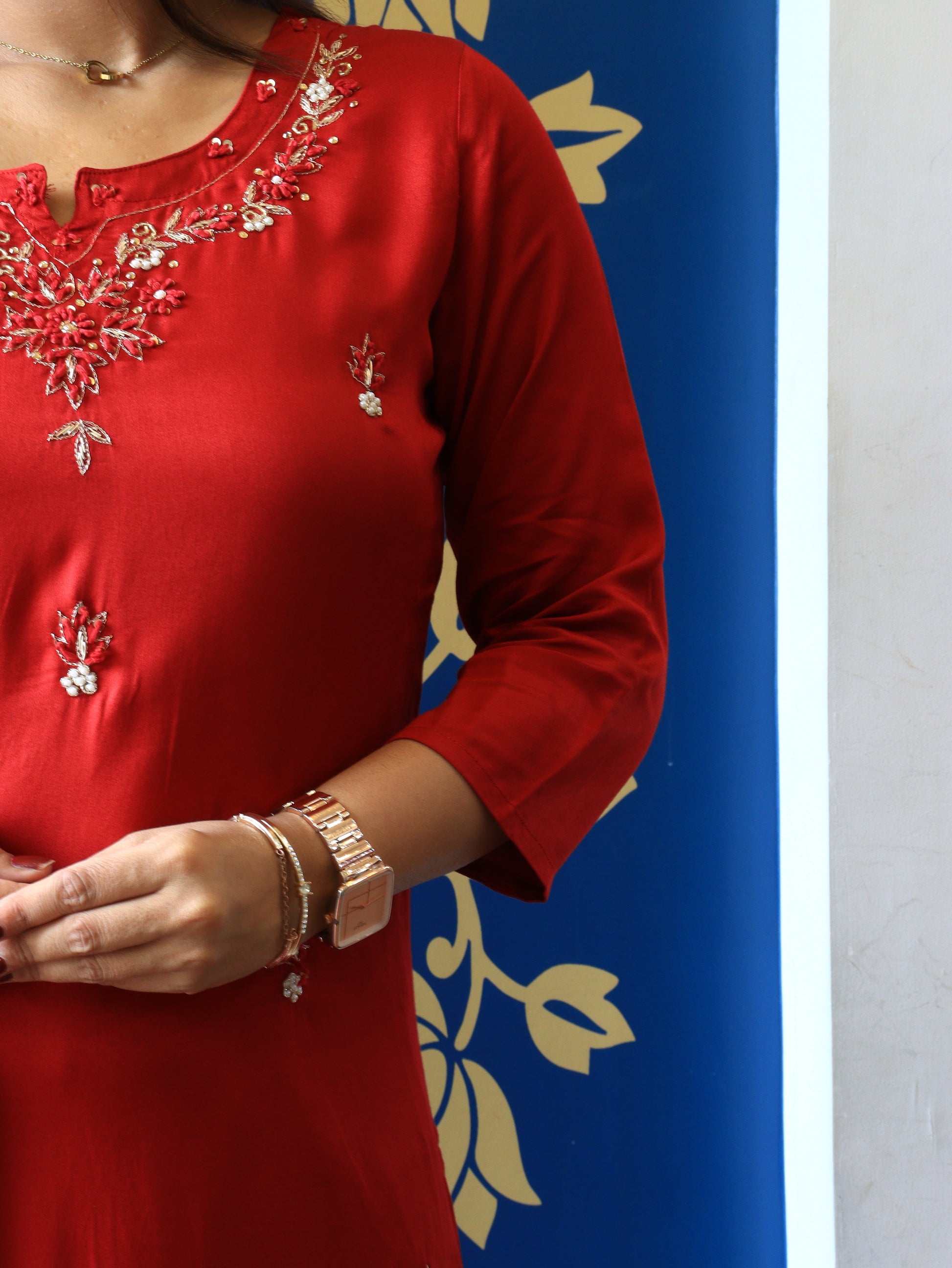 Brighten your festive wardrobe with this vibrant crimson red/maroon silk suit set featuring refined hand-embroidered detailing on the neckline and delicate motif embellishments throughout. The ensemble is elevated with a rich Kashmiri-inspired digital print dupatta, adding a graceful traditional touch. Crafted in premium silk, the outfit offers a rich fall, elegant shine and all-day comfort—ideal for poojas, celebrations, and special occasions.