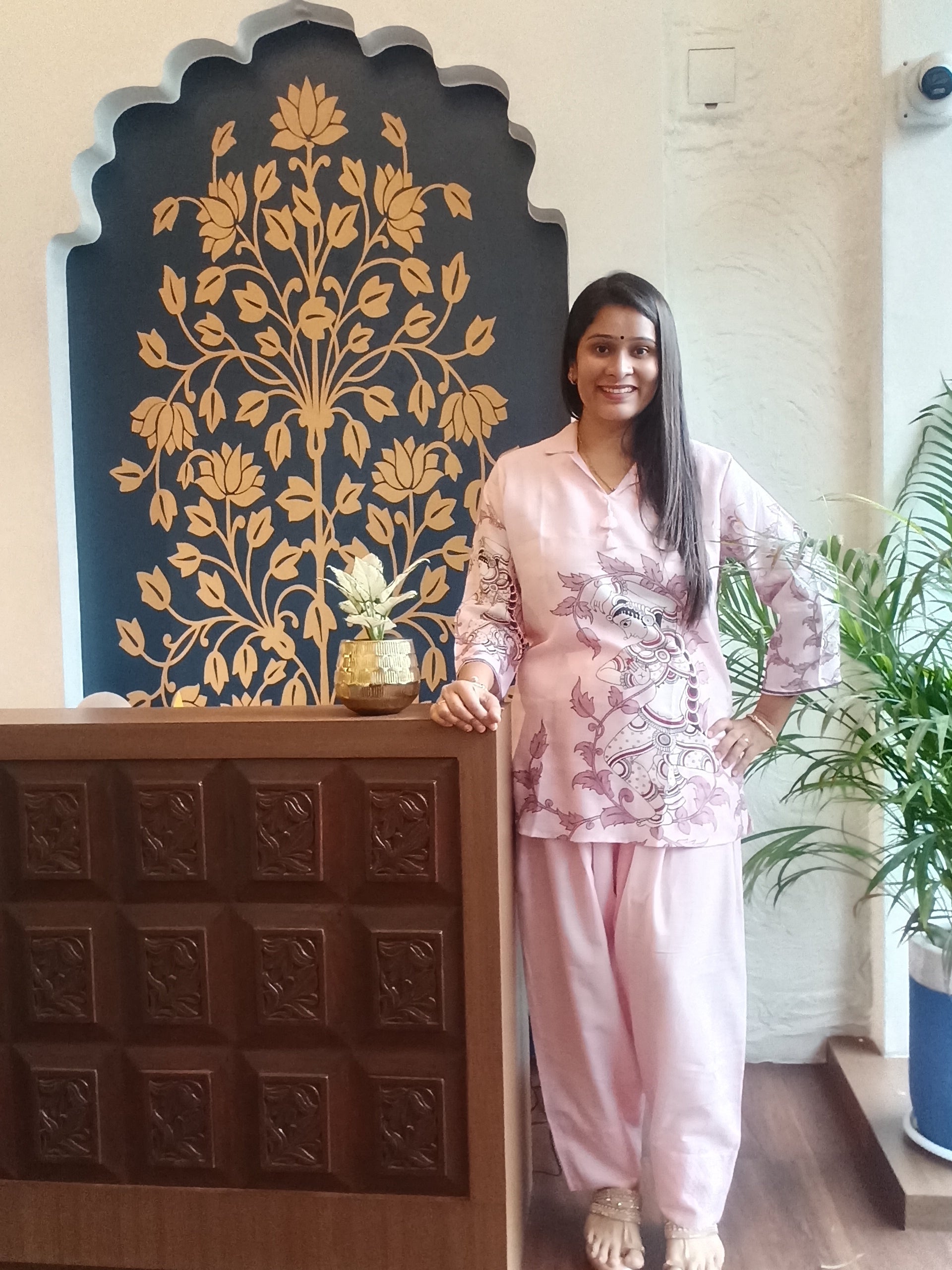 A chic and graceful pastel pink co-ord set featuring a V-neck kurta with long sleeves, highlighted with delicate floral and paisley-inspired prints in subtle tones. The kurta is paired with relaxed-fit plain matching bottoms for an effortlessly elegant look. Perfect for day wear, festive get-togethers, or casual outings, this outfit offers a blend of comfort, style, and sophistication.