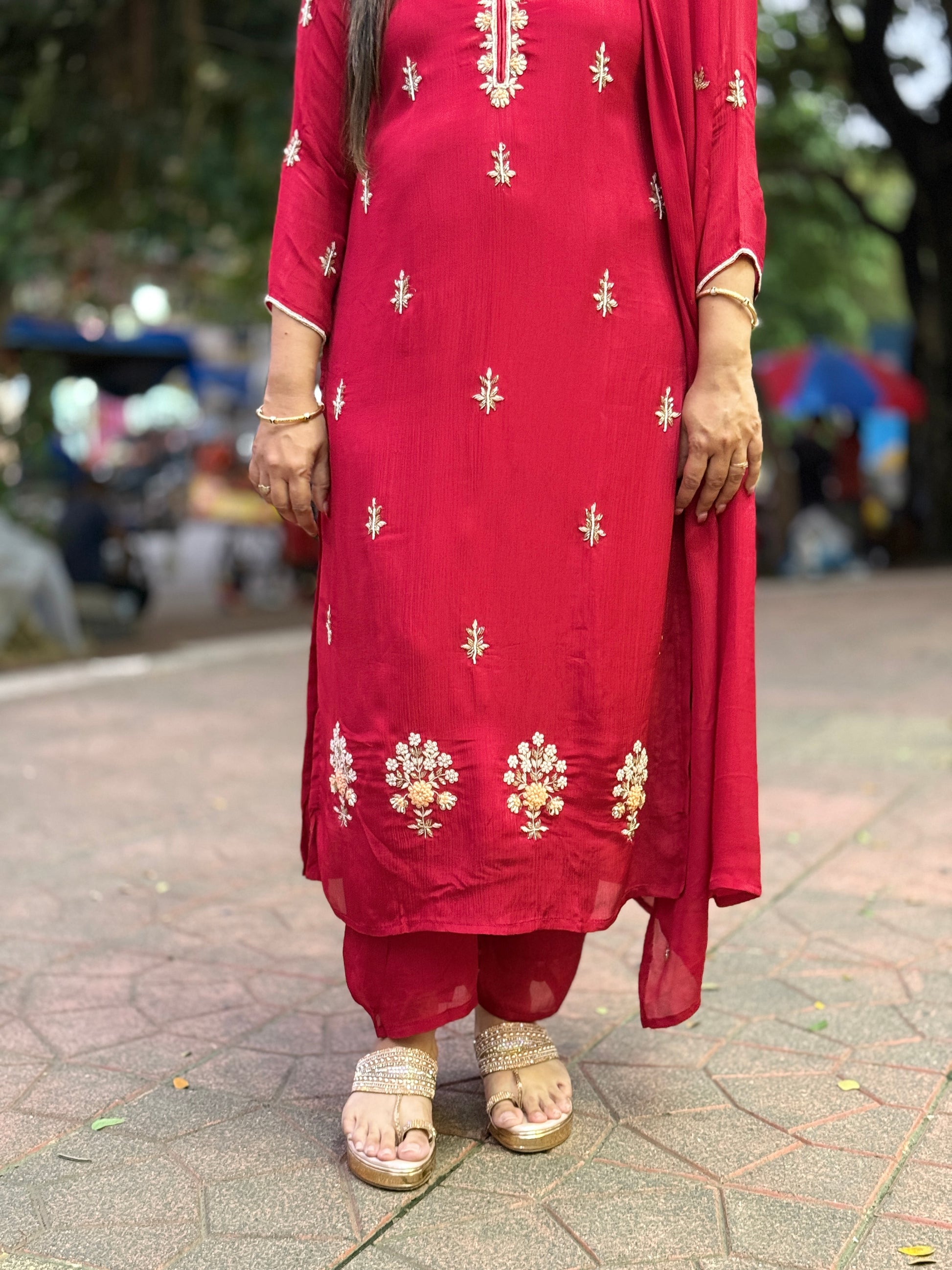 Step out in elegance with this Ruby Red Embroidered Kurta Set, featuring delicate golden thread embroidery across the front and hemline. The straight-fit kurta comes with three-quarter sleeves and a classic round neckline with intricate detailing. Paired with matching straight pants and a coordinating dupatta, this outfit is perfect for festive gatherings, casual celebrations, or evening outings. Crafted in soft, breathable natural crape fabric for all-day comfort and effortless grace.