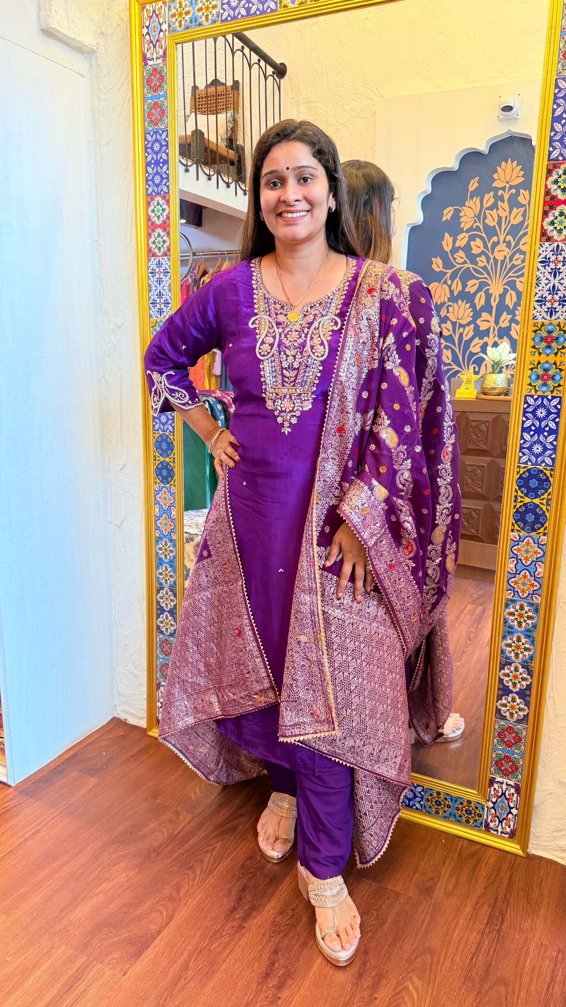 Details: Rich crape straight kurta featuring intricate zari and resham embroidery on the neckline and sleeves, paired with matching silk pants. Comes with a beautifully woven Banarasi silk dupatta in complementing tones with traditional motifs.