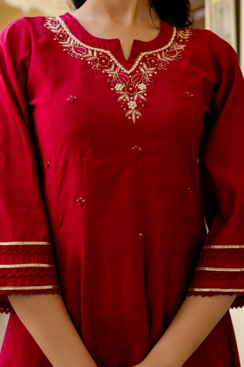Embrace the festive spirit with our opulent Deep Red Anarkali Set. The rich, deep crimson hue of this three-piece suit is instantly eye-catching and flattering. The Anarkali kurta features a gracefully flowing silhouette and a beautifully embellished neckline with Zari, Thread Work. The sleeves and a delicate border on the hem and trousers are accentuated with subtle Gota Patti or Zari trims, adding a touch of golden sparkle.