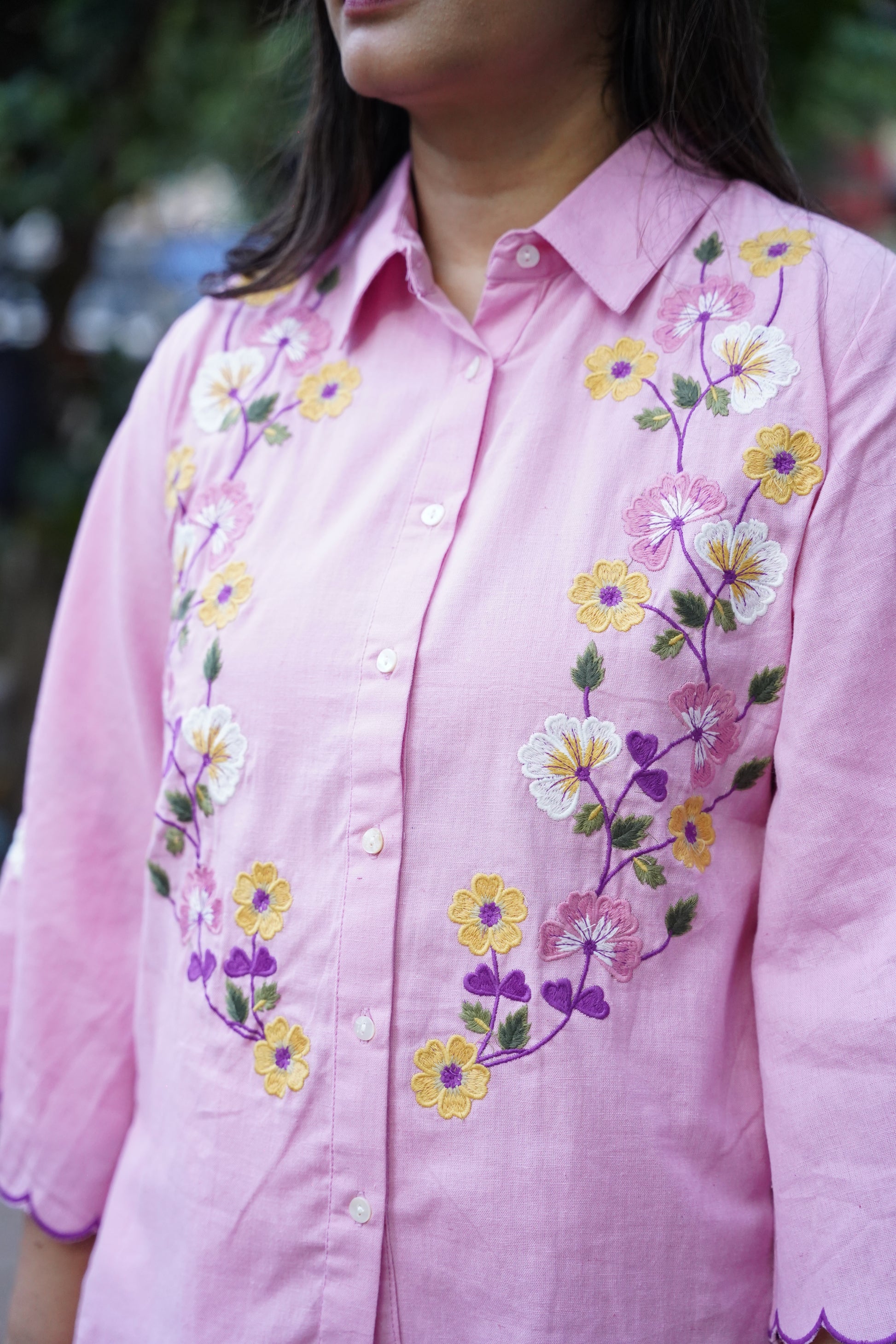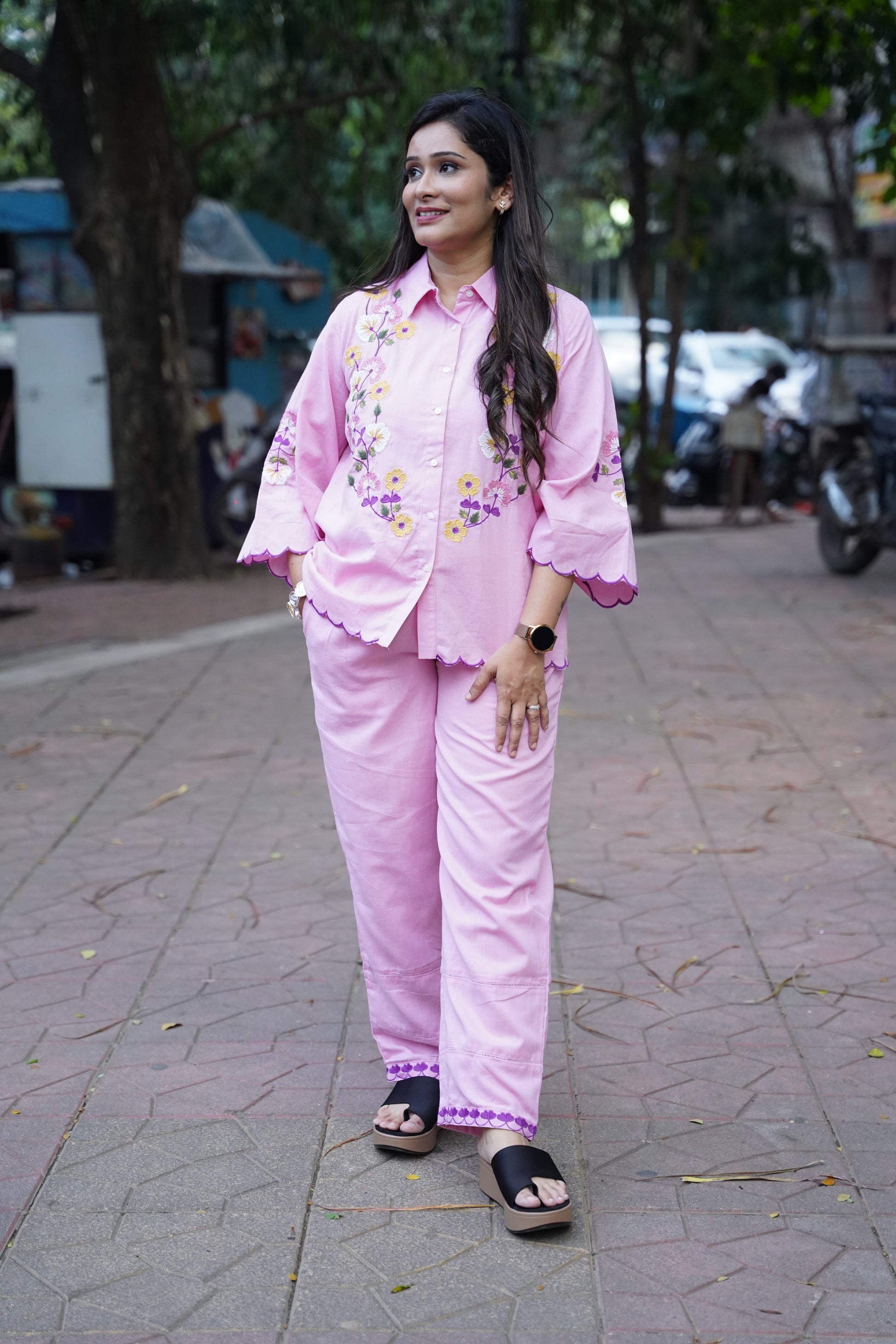 Work: Beautiful floral embroidery gracing both the shirt and pants, adding a touch of romantic charm.