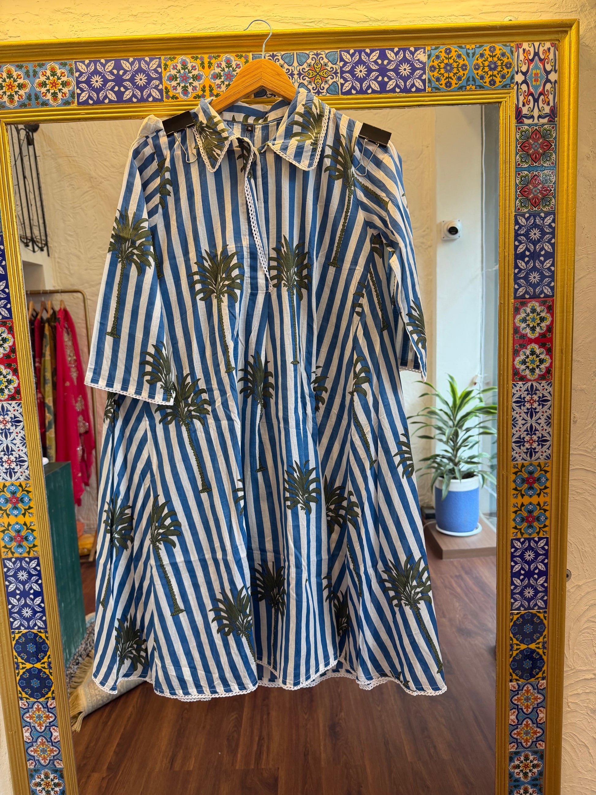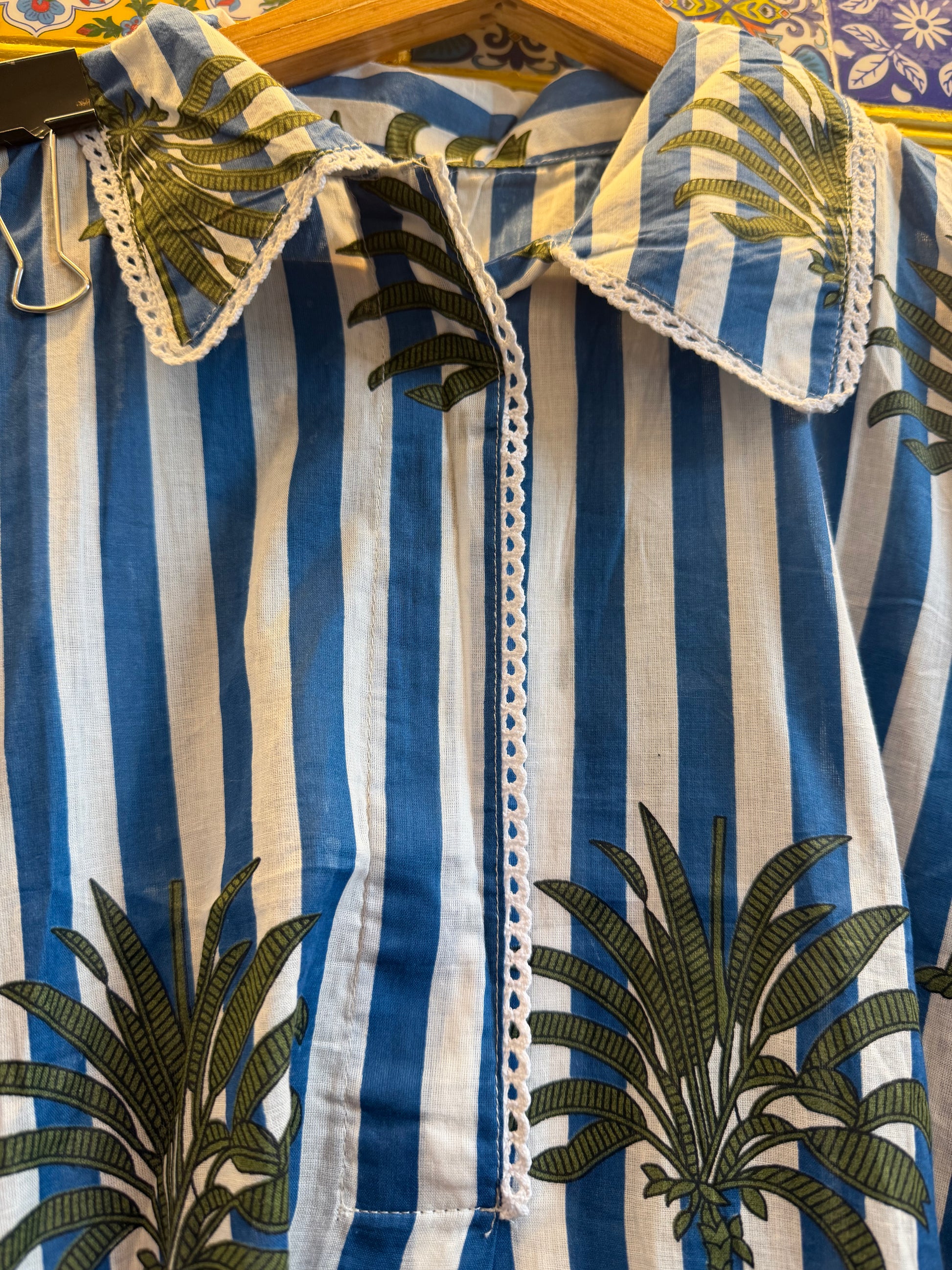 Color palette: Crisp white and blue striped base adorned with green block-printed palm tree motifs.