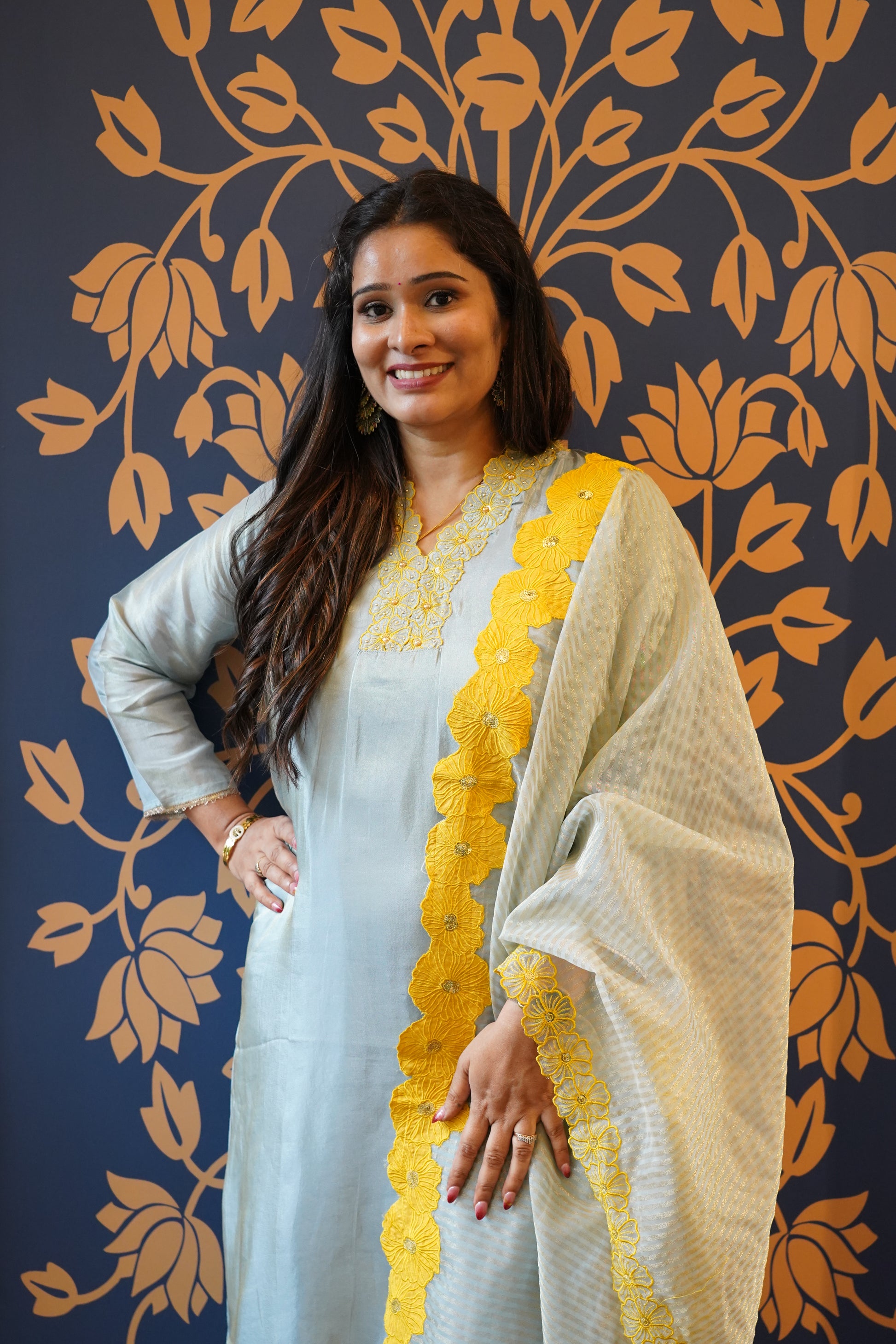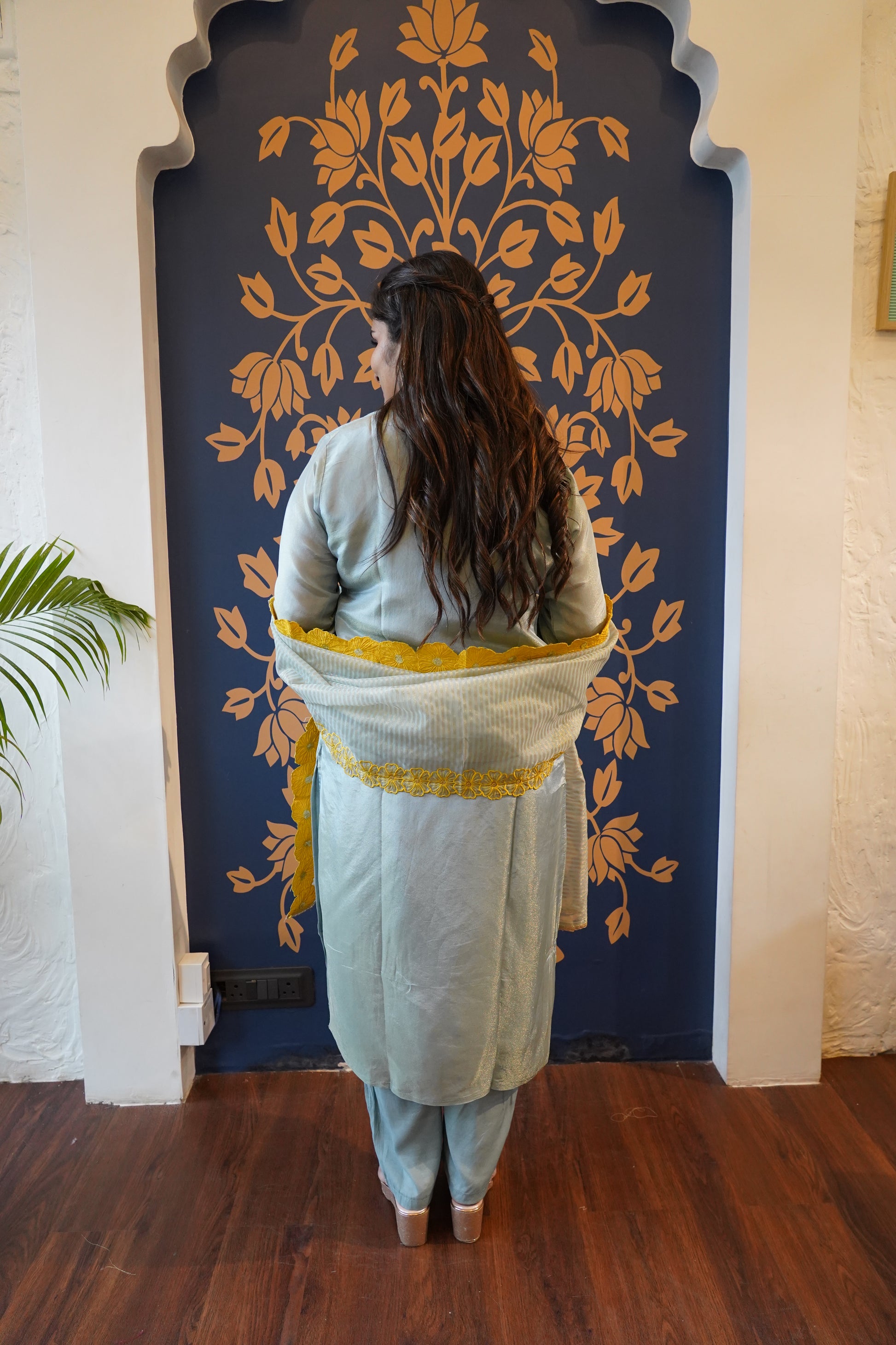 Step into effortless grace with this Aqua Elegance Suit Set, crafted from soft silk blend fabric in a soothing pastel aqua tone. The kurta is highlighted with delicate floral yellow lace embroidery along the hemline, bringing a refreshing pop of color. The airy dupatta features subtle golden zari lines and matching yellow floral applique detailing, perfectly balancing tradition with modern charm. A light, comfortable, and stylish choice for festive occasions, casual gatherings, or daytime celebrations.