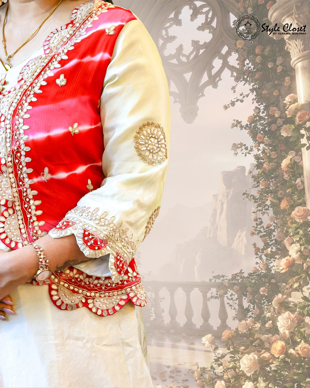 The highlight of the ensemble is the vibrant red or green tie-dye jacket, intricately adorned with gota patti hand work, zari detailing, scalloped edges, and hand-embroidered patterns. The front-tie jacket enhances the silhouette, making it perfect for festive gatherings, haldi/mehendi functions, family celebrations, and traditional events.
