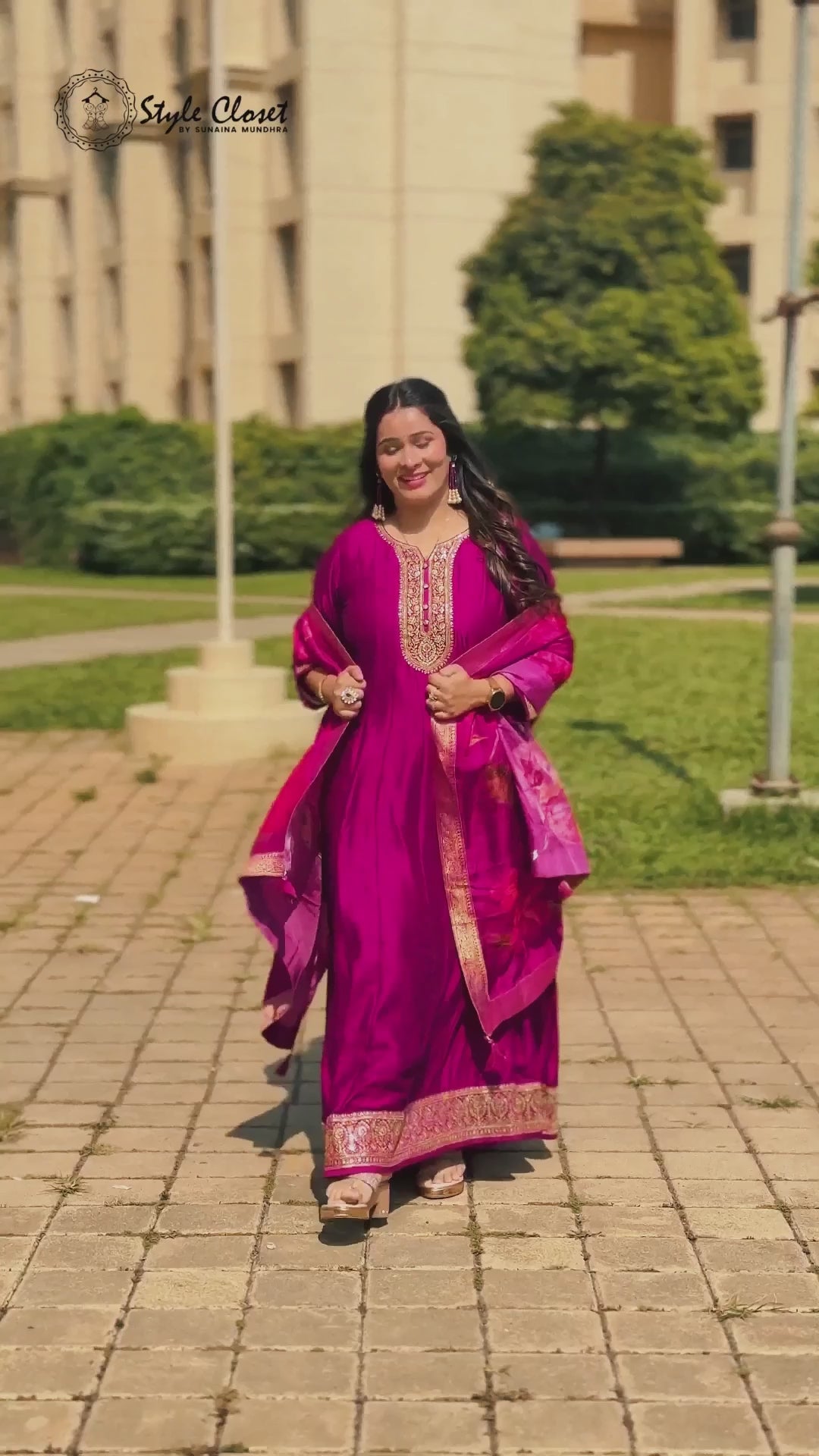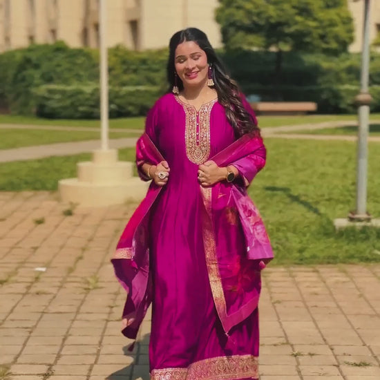 Grace meets glamour in this stunning magenta kurta set. Crafted from flowy Dola Silk fabric, the outfit features intricate zari hand embroidery on the neckline, sleeves, and hemline for a regal finish. Paired with a beautiful printed dupatta that adds a pop of contrast, this ensemble is perfect for festive occasions, family gatherings, and celebrations. Comfortable yet elegant — a timeless piece for your ethnic wardrobe.
