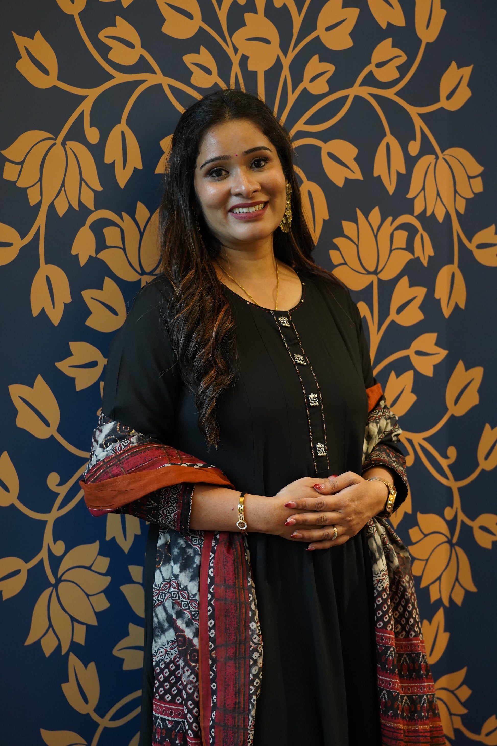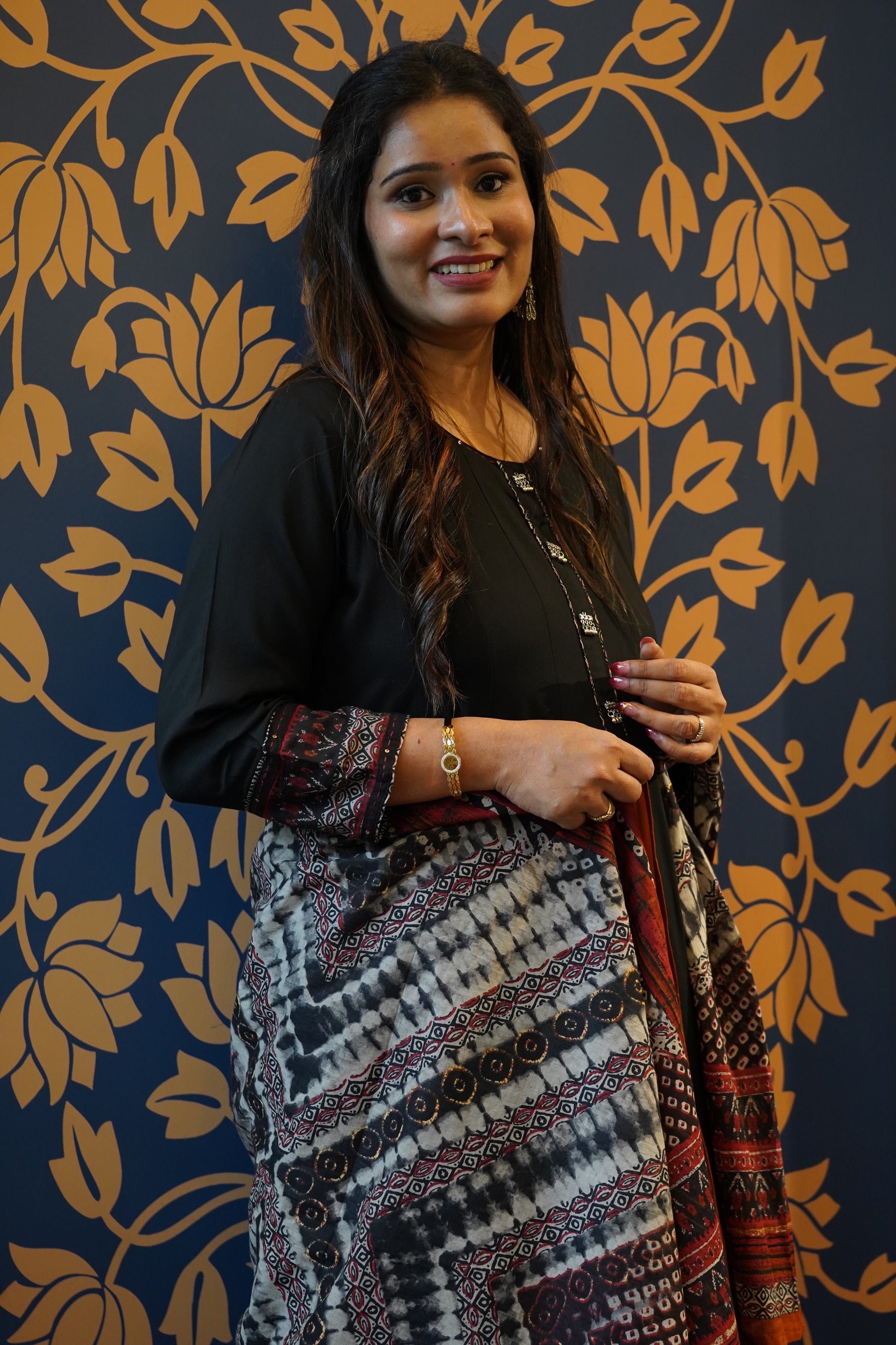 Step into elegance with this classic black Anarkali set, designed to make a statement with its effortless grace. The kurta features delicate mirror and thread work on the neckline, enhanced with printed borders on the sleeves and hemline for a subtle yet rich finish. Paired with a stunning Ajrakh-inspired dupatta in earthy rust, maroon, and ivory hues, this ensemble beautifully balances traditional craft with modern sophistication. A timeless pick for festive evenings, family gatherings, or cultural celebrations.