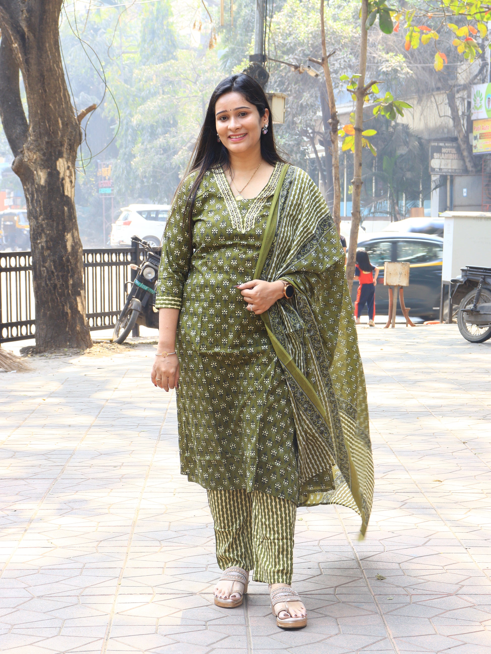 The soft cotton dupatta features stripes and floral borders, adding a graceful finishing touch to the look. Perfect for office wear, casual outings, festive gatherings, or everyday comfort.