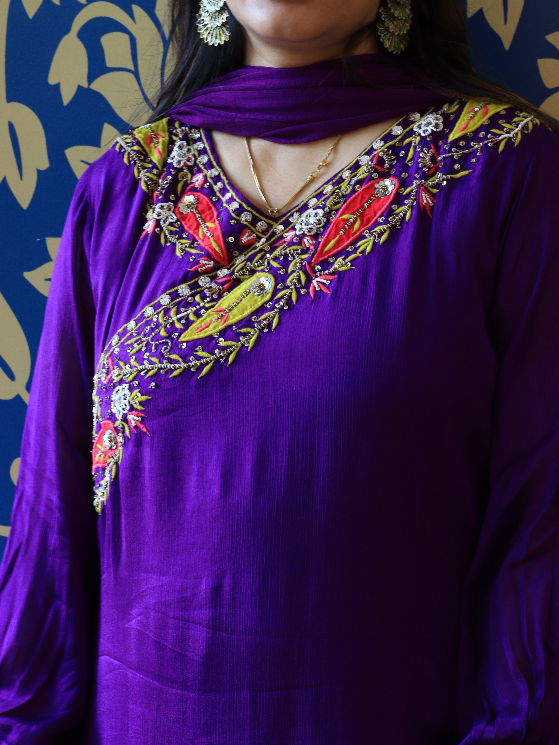 Bring effortless elegance to your festive and occasion wear with this stunning Royal Purple/Bright Orange A-line Kurta Set. Crafted in a soft, flowy chinon fabric, the kurta features beautifully detailed hand embroidery across the neckline and shoulder—highlighted with intricate cutdana, resham threadwork, sequins, and bead embellishments in floral and leaf motifs.