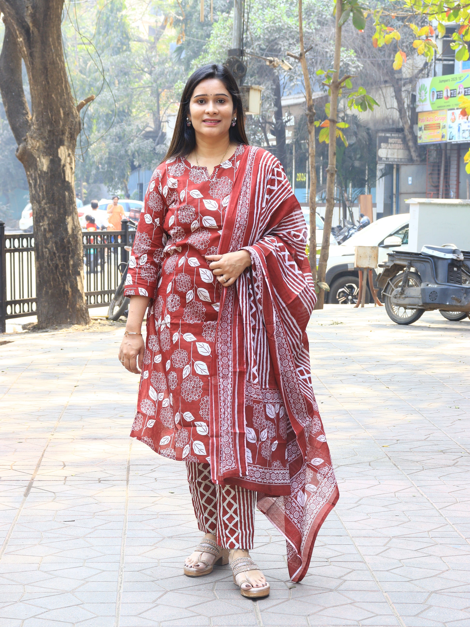 Rust Red Handblock Floral Cotton Kurta Set with Dupatta