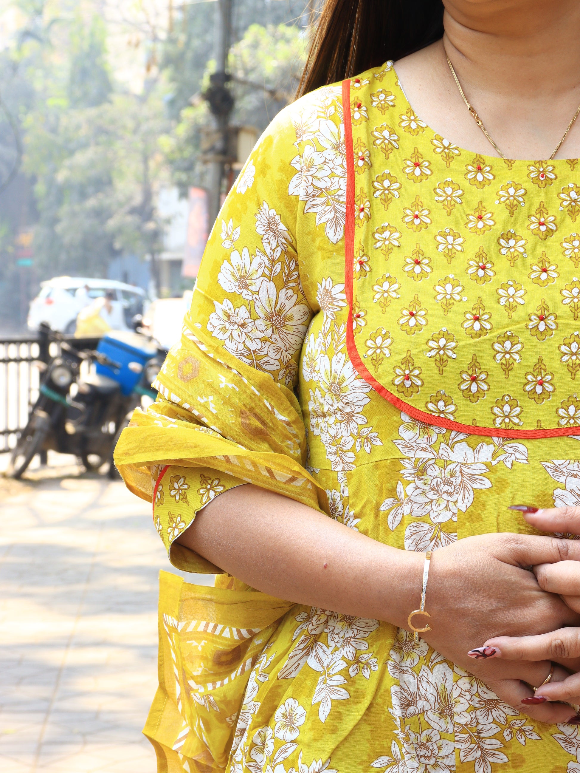 Bright, elegant, and effortlessly stylish — this yellow handblock-printed kurta set is designed for everyday comfort with a touch of traditional charm. The kurta features a beautiful combination of two floral prints: delicate all-over white floral motifs on the body and a contrasting small buti print on the yoke, highlighted with subtle orange piping for a refined finish.