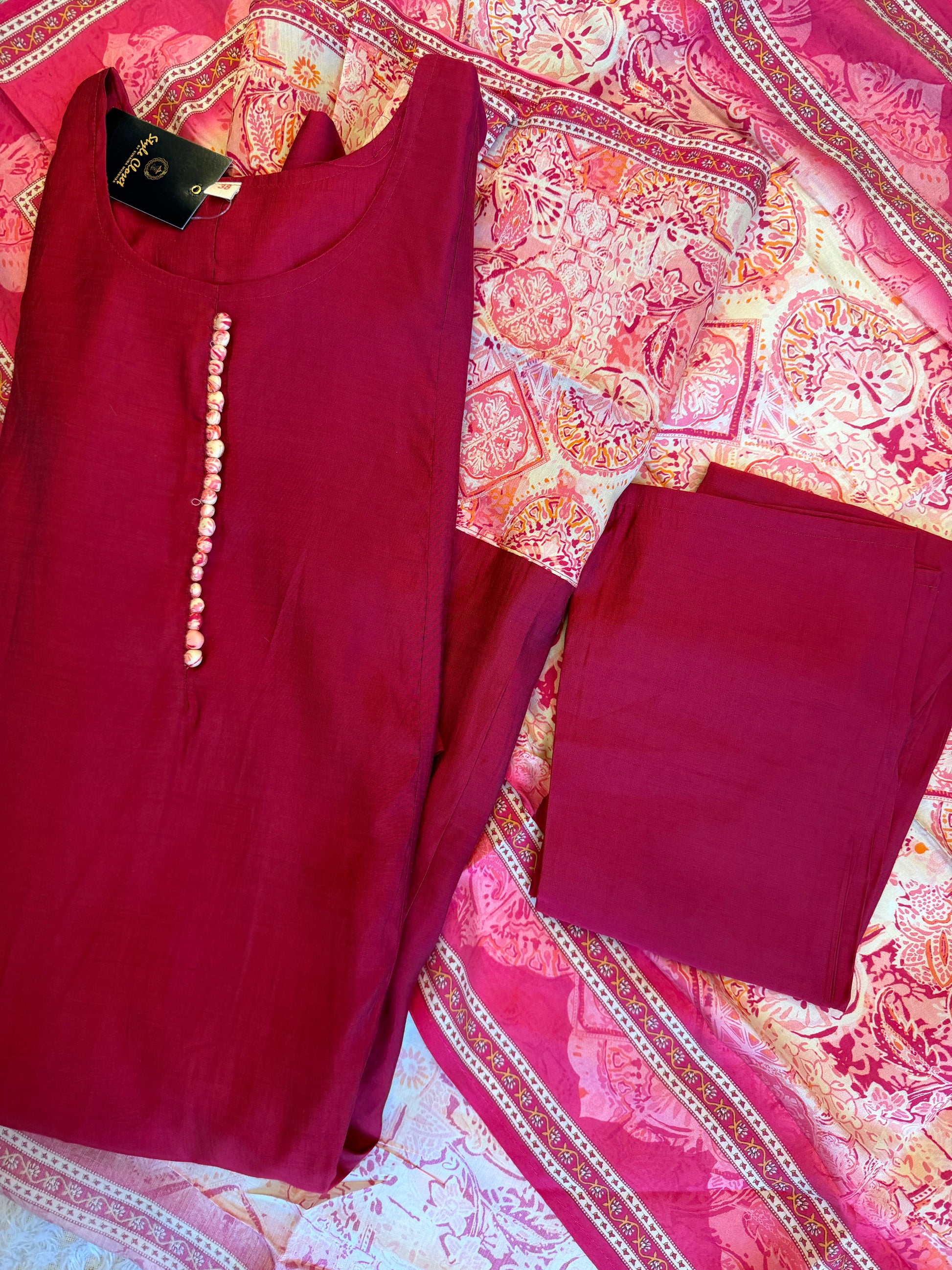 Elevate your ethnic wardrobe with this striking Magenta Anarkali Set. Crafted from premium breathable fabric, the floor-length kurta features a subtle sheen and delicate button detailing on the bodice. The highlight of this ensemble is the wide-bordered hem and the exquisitely printed organza dupatta that adds a touch of ethereal grace. Perfect for festive celebrations, weddings, or evening soirées.