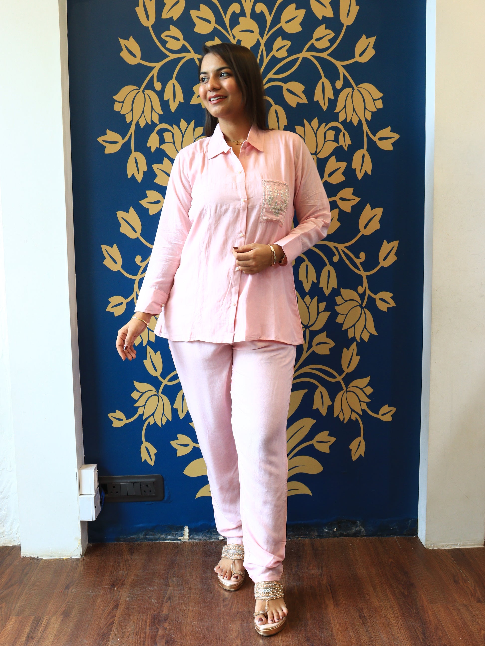 Elevate your everyday wardrobe with our "Lumiere" Co-ord Set. Crafted from a premium, breathable linen-blend fabric, this set features a relaxed-fit button-down shirt paired with matching straight-cut trousers. The standout feature is the intricately hand-embroidered chest pocket, adorned with shimmering sequins and silver cut dana hand-work in a delicate floral motif.