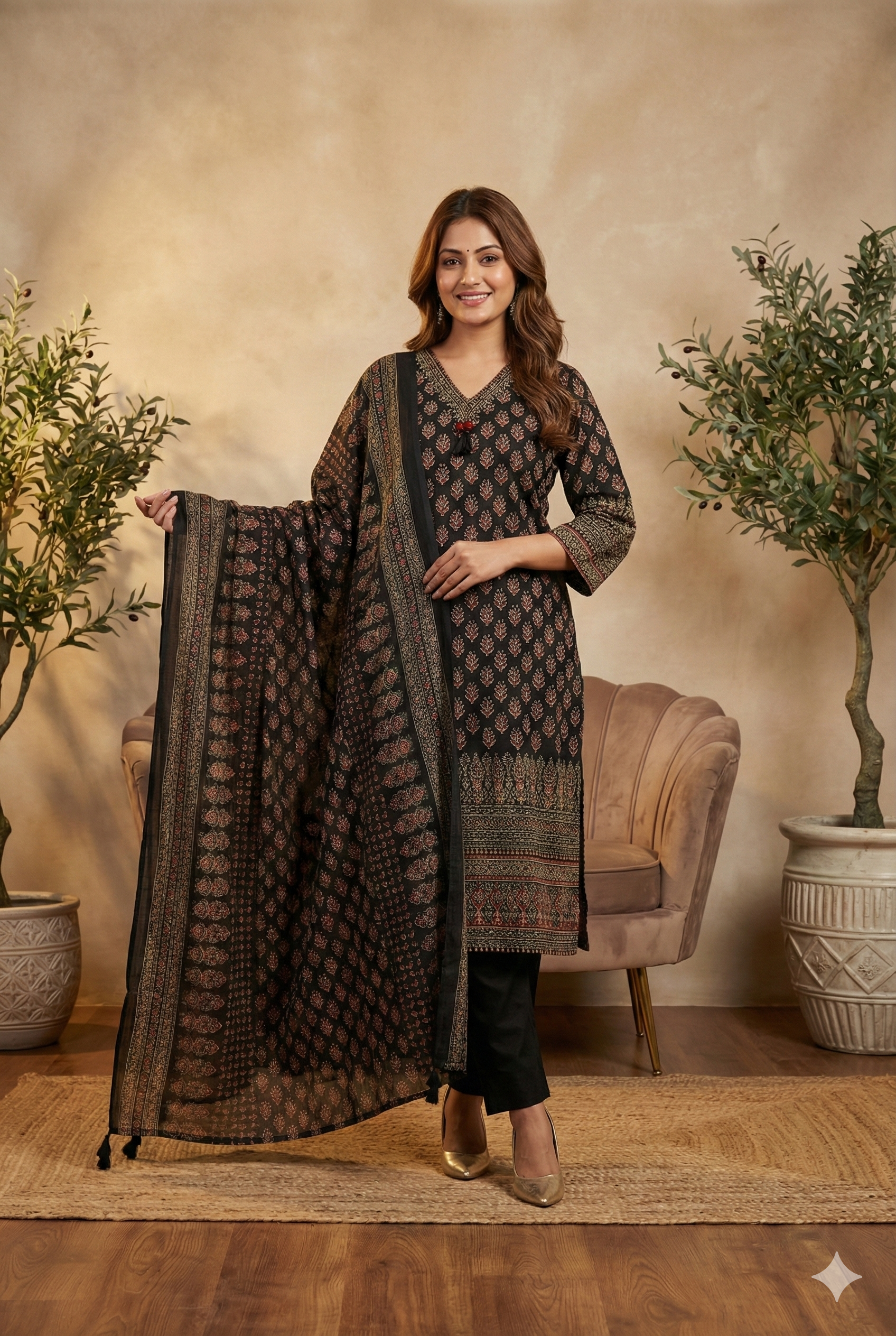 Step into timeless elegance with our Midnight Bagh Suit Set. This stunning ensemble celebrates the beauty of traditional artistry on a canvas of deep, sophisticated black. The kurta features an intricate, all-over earthy red and beige block-print motif, finished with a striking geometric border at the hem and sleeves.